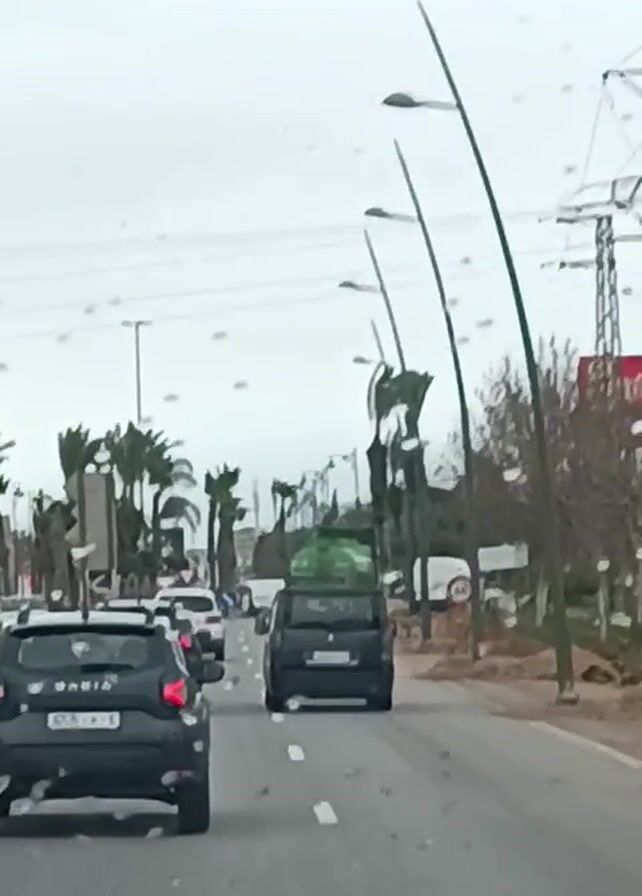 view from inside a car driving on a road, with a gray sky and rain visible on the windshield. The road has white lane markings and is lined with palm trees and light poles. Several cars are in front of the vehicle, including a dark gray Dacia and a black van. A Shell gas station sign is visible in the background. The video appears to be taken during the day in an urban area, possibly in a rainy, tropical climate.