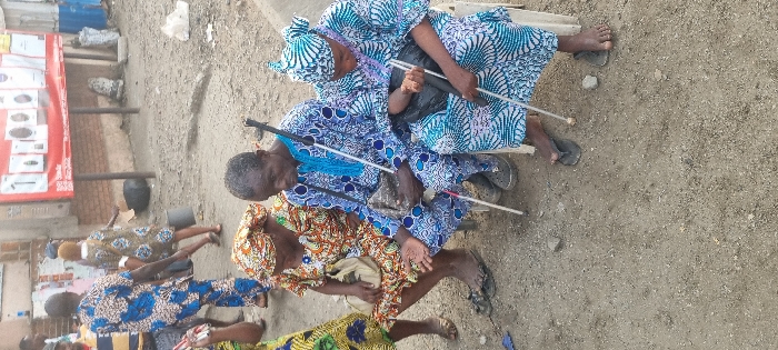 Several elderly, likely visually impaired, individuals sit and stand outdoors. They are dressed in colorful, patterned clothing. Each holds a white cane, indicative of blindness. The setting appears to be an unpaved street or market area. A building and advertisements are visible in the background. The overall impression is one of poverty and disability in a public space.