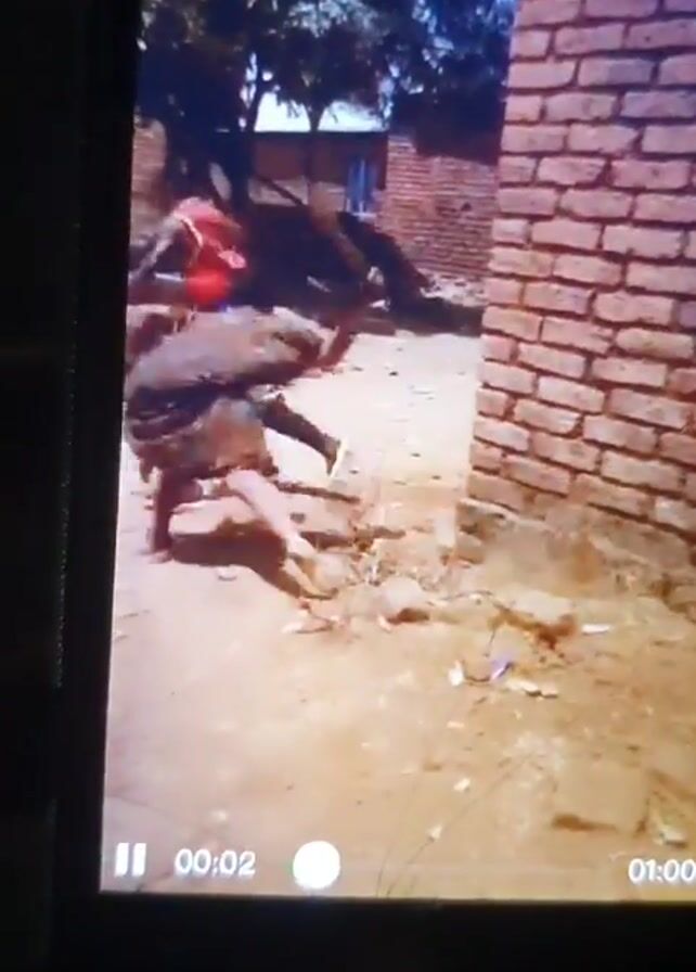 person standing over another person who is on their knees. The standing person is swinging what appears to be a machete. The person on the ground covers their head and appears to be trying to protect themselves. The standing person then chases after someone while still swinging the machete. The surrounding area appears to be a residential neighborhood.