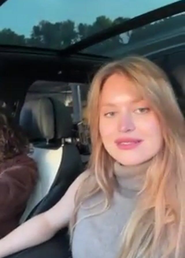 Inside a car, a woman with long blonde hair, wearing a gray sleeveless turtleneck, smiles at the camera and says, “What’s up guys. Let’s take a ride.” The car starts. The car’s interior is black and white. The camera pans to the driver who has curly brown hair and is wearing a brown jacket. The dashboard is visible and has a white steering wheel. Outside, other cars are parked along a street.