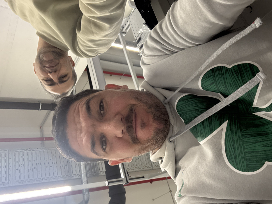 This image depicts two adult males in an indoor, industrial or commercial setting characterized by exposed overhead utilities. The photograph is taken from a low-angle perspective. The primary subject, positioned in the foreground, is a male with dark hair and a light beard/stubble. He is wearing a grey hooded sweatshirt (hoodie) featuring a large green shamrock (three-leaf clover) design on the chest. He is looking directly at the camera with a neutral to slightly smiling expression. A second male subject is visible in the upper portion of the frame, positioned behind and above the foreground subject, appearing partially upside down relative to the main perspective. He has lighter hair and is wearing a light-colored, long-sleeved top, possibly beige or light olive green. He is also looking towards the camera with a neutral expression. The background shows a brightly lit ceiling with numerous rectangular overhead light fixtures. Exposed infrastructure includes multiple metallic cable trays, dark-colored pipes or conduits, and a segment of a red pipe, likely part of a fire suppression system, indicating a functional or utility space. The precise location within Berlin, Germany, cannot be determined from the visual information provided.