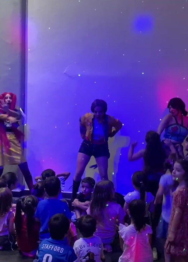 The scene captures a vibrant gathering of children, mostly seated on the floor, watching three performers dancing in front of them. The dancers, dressed in colorful outfits with striking hair colors, dominate the foreground. The lighting shifts, casting a kaleidoscope of blue, pink, and green hues across the white backdrop. The children are diverse in their attire, with one boy prominently wearing a blue jersey with the number 9 and the name "STAFFORD" on the back. A smartphone is visible in the lower right corner, held by someone likely recording the event. The overall atmosphere is lively and animated, suggesting a children's entertainment event or party.