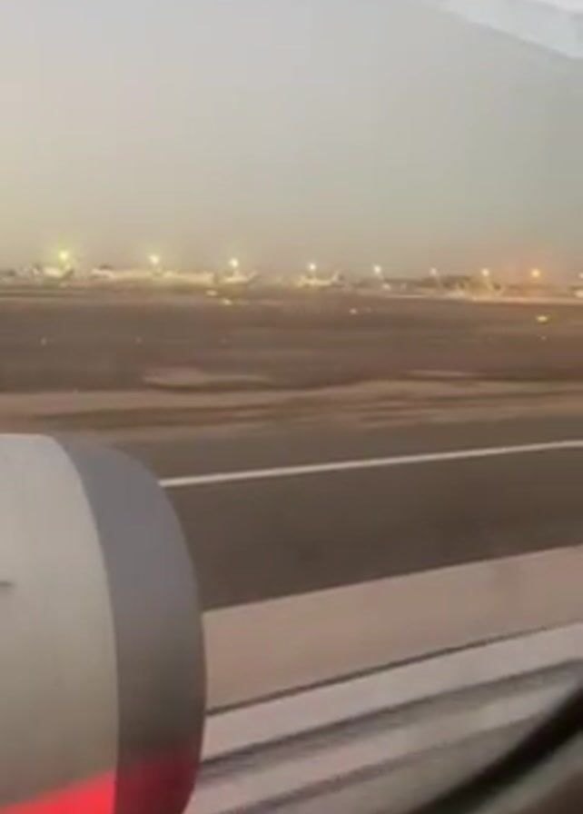 view from an airplane window. The airplane is on a runway with the engine visible in the foreground. In the distance, there are airport lights. The sky is overcast, giving the scene a muted, slightly hazy appearance.