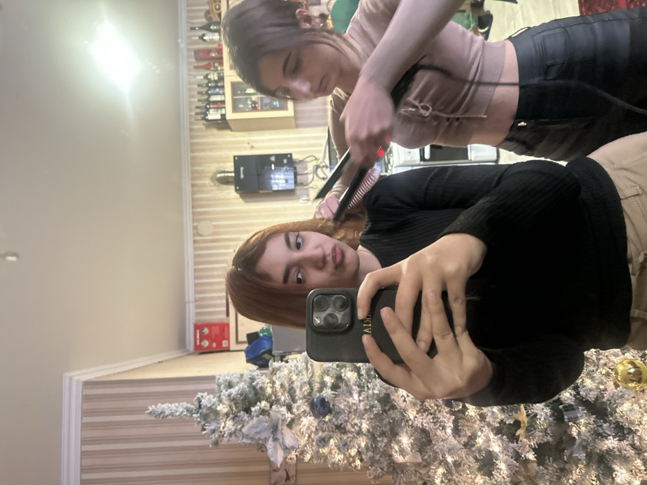 The scene is an indoor mirror selfie captured in a domestic setting in Tbilisi, Georgia. Two young females are present. In the foreground, a female with reddish-brown hair, wearing a black ribbed long-sleeved top and light-colored pants, holds a dark-colored smartphone with a multi-lens camera array to take the photograph. She displays a pouting facial expression. Behind her, a second female with dark brown hair is actively styling the first female's hair using a black heated hair straightener with visible red heating elements. The second female is dressed in a light brown cropped long-sleeved top with ruched detailing and dark-colored pants. The environment includes a white, flocked Christmas tree adorned with blue and silver ornaments and lights, positioned on the left side. The walls feature light-colored vertical striped wallpaper. To the right, elements of a kitchen or dining area are visible, including a partial view of a white appliance, a dark wall-mounted utility box with visible wiring, and shelves displaying multiple bottles of alcohol. A bright light source is prominently reflected in the upper right portion of the mirror.