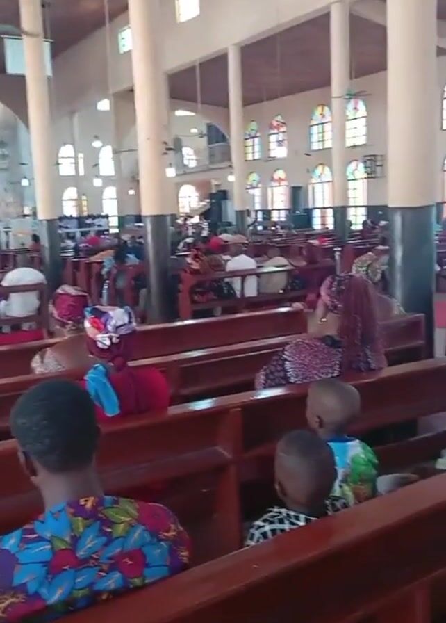 inside of a church. There are many wooden pews, most of which are occupied by people. Some of the people are wearing colorful traditional clothing. There are also a few children present. The church has high ceilings and many stained-glass windows. There are also large speakers in the background. The camera moves slowly, showing different parts of the church interior. Some singing or music can be heard.