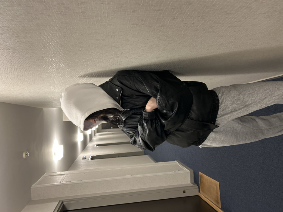 An individual is depicted standing in an interior building hallway. The subject, whose face is largely obscured by a raised white hood, wears a white hooded sweatshirt, a black leather bomber jacket, and light grey sweatpants. Their arms are crossed at chest level, and they are leaning against a textured, light beige wall on the right side of the frame, facing left. The hallway features a dark blue carpet with a lighter blue strip along the baseboards. Multiple dark-colored doors, indicative of individual units, are visible along the left wall of the hallway, receding into the background. A rectangular brown mat is positioned on the carpet near the leftmost foreground door. Overhead lighting fixtures are recessed into the ceiling, providing illumination. A smoke detector is affixed to the ceiling in the foreground. The specific location within Cachan, France, is an interior corridor, consistent with a residential or hotel building, but further precise identification is not possible from the image.