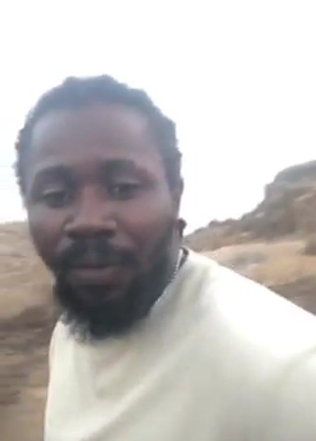 The video features a man with dreadlocks and a beard, wearing a light-colored shirt, who appears to be recording himself while outdoors on a rocky, hilly terrain