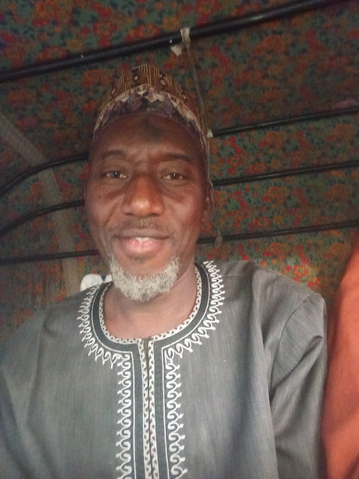 A middle-aged man with dark skin and a graying beard smiles slightly at the camera. He wears a traditional hat and a gray shirt with white embroidery around the collar and front. The background appears to be the interior of a vehicle, possibly a taxi, with a patterned ceiling. The lighting is soft, and the image is generally in focus. Part of another person is visible at the edge of the frame.