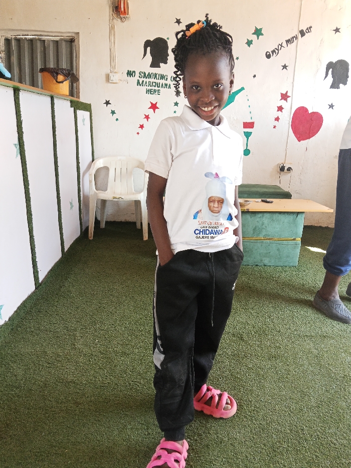 A young girl stands smiling in an establishment located in Sabon Tasha, Nigeria. She has dark skin and braided hair, adorned with an orange clip. She wears a white polo shirt with a printed image of a man in a white cap and traditional attire, beneath which is text that includes "LATE ALHAJI LATE BAKACI CHIDAWA GAJERE MARAN." Her attire also consists of black track pants with a white and grey side stripe and pink, textured sandals. Her hands are in her pockets. The floor is covered with green artificial turf. The white walls are decorated with black silhouettes of women's profiles, black, green, and red stars, a red heart, and a silhouette of a wine bottle and glasses. Green text on the wall states "NO SMOKING OR MARIJUANA HERE," and black text reads "ONYX MINI BAR." To the left, a white and green paneled structure, possibly a counter, is visible with a yellow bucket containing a black plastic bag on top. A white plastic chair rests against the wall. A corrugated metal structure is partially visible in the background on the left. To the right, a green cushioned bench or ottoman with a wooden tabletop is present. Electrical outlets and wiring are visible on the wall. A partial view of another person's lower leg and foot, wearing grey slip-on shoes, is visible on the far right.
