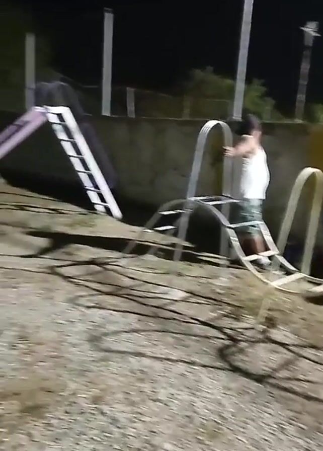 playground at night. Two adults are visible, along with some children's play equipment: a curved ladder, a slide, a swing, and a seesaw. The scene is lit artificially, but it’s still dark. One of the adults is wearing a red shirt. The other is wearing a white shirt and shorts. The ground appears to be covered in small rocks or gravel. The playground is bordered by a low wall.
