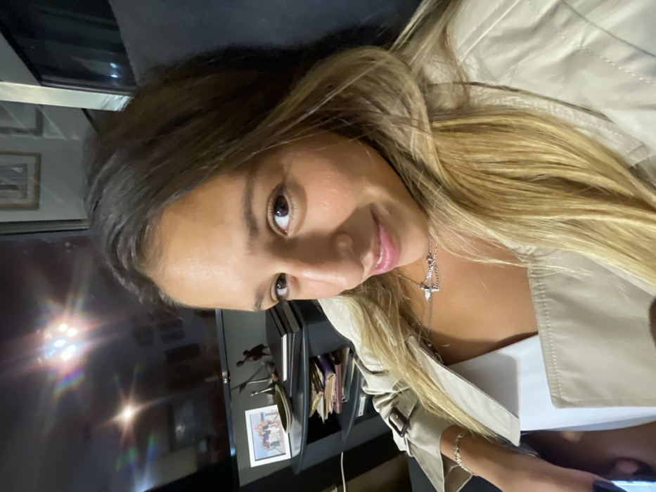 The image depicts a female individual in an indoor residential or private setting, likely a living room or den. The subject is a female with long, multi-toned brown hair, appearing to be in a close-up selfie or portrait. She is wearing a light beige trench coat over a white top, with a silver chain necklace featuring a prominent cross pendant. A silver bracelet is visible on her left wrist. She is looking directly at the camera with a subtle smile. The background is dimly lit, featuring a large, dark television screen that reflects several bright light sources. Beneath the television, a dark console table holds a framed photograph, a dark ornamental object, and a stack of books or papers. A portion of dark upholstered furniture is visible to the right. The specific city of this unknown location cannot be determined from the image.