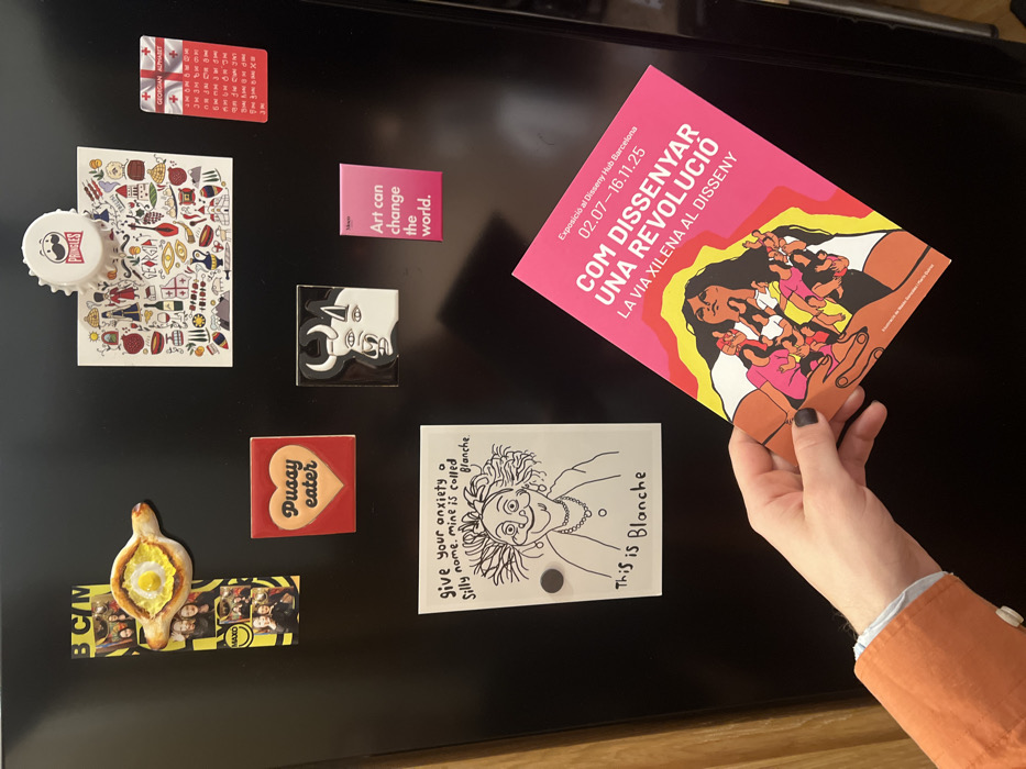 A black refrigerator door in a domestic setting, located in Podgorica, Montenegro, is adorned with multiple magnets and a hand holding a flyer. The refrigerator surface is glossy. A left hand, with pale skin and dark nail polish on the visible fingers, wearing an orange sleeve over a light blue cuffed shirt, holds a bright pink vertical flyer. The flyer promotes an exhibition at Disseny Hub Barcelona, titled "COM DISSENYAR UNA REVOLUCIÓ LA VIA XILENA AL DISSENY," with dates 02.07 - 16.11.25. The flyer features an illustration of a woman with dark hair, large hands, and several smaller figures within her hands. Arranged on the refrigerator are various magnets: * A vertical yellow strip magnet displays "BCM" at the top and "MAXI" towards the bottom, containing multiple small photographic images of individuals. * A three-dimensional magnet shaped like a Georgian Khachapuri bread, featuring a yellow egg yolk in its center. * A white rectangular magnet beneath a Pringles lid magnet, both depicting various colorful illustrations of Georgian cultural symbols and motifs. * A red square magnet with the text "Pussy eater" in white within a heart design. * A red rectangular magnet listing characters of the Georgian alphabet. * A black and white square magnet portraying a stylized bull or minotaur head with multiple eyes. * A small pink rectangular magnet with the text "Art can change the world." and "Moco" in smaller print. * A white rectangular note, held by a small dark circular magnet, features a black line drawing of an elderly woman with wild hair and a necklace. The text reads: "give your anxiety a silly name. mine is called Blanche." and "This is Blanche."