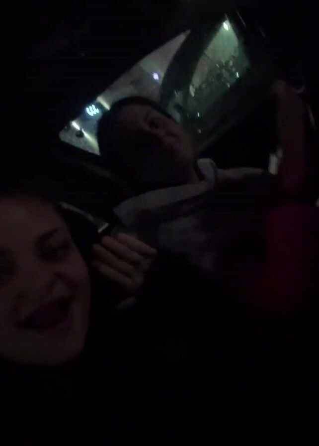 two people in a car at night. A young woman with red lipstick is visible in the lower left corner, filming. Another person, also young, is in the passenger seat. They seem to be embarrassed or trying to hide their face, covering it with their hands. There is music playing in the background. The environment outside the car is dark, with some faint lights.