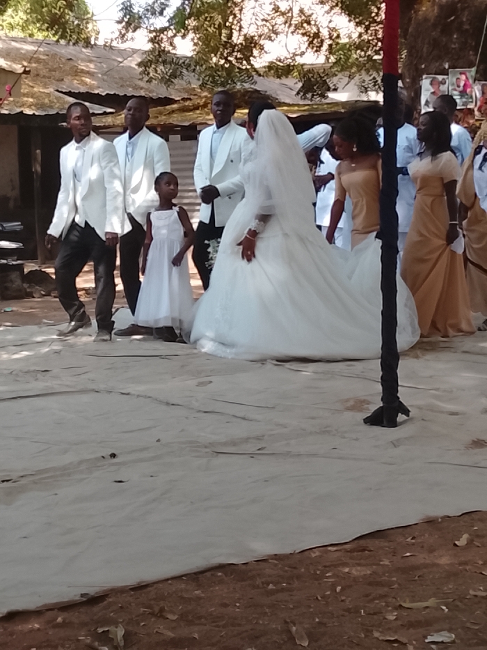 The image captures an outdoor wedding scene in Unknown, Unknown. A light-colored fabric tarp covers the majority of the ground in the foreground and midground, with reddish-brown dirt and scattered dry leaves visible at the bottom. Nine individuals are present, dressed in formal attire. An adult female, the bride, is centrally positioned, seen mostly from behind and to her right, wearing a voluminous white wedding gown with a long veil, a tiara, and wrist jewelry; her right hand rests on the dress. To her left and slightly behind her is a young girl in a white sleeveless dress, looking towards the right. Three adult males are to the left of the bride and girl, all wearing matching white formal vests, jackets over light shirts, and dark trousers. The leftmost male is mid-stride. To the far right, an adult female in an off-the-shoulder light brown/tan dress is visible, with other individuals in similar attire and a white top partially visible further right. A dark pole with red and black wrapping stands vertically on the far right, anchored by a dark, claw-like base. The background features green trees and a low-rise structure with a corrugated metal roof. Framed images or decorations are faintly visible among the foliage in the far background right. The scene is illuminated by bright, natural daylight.