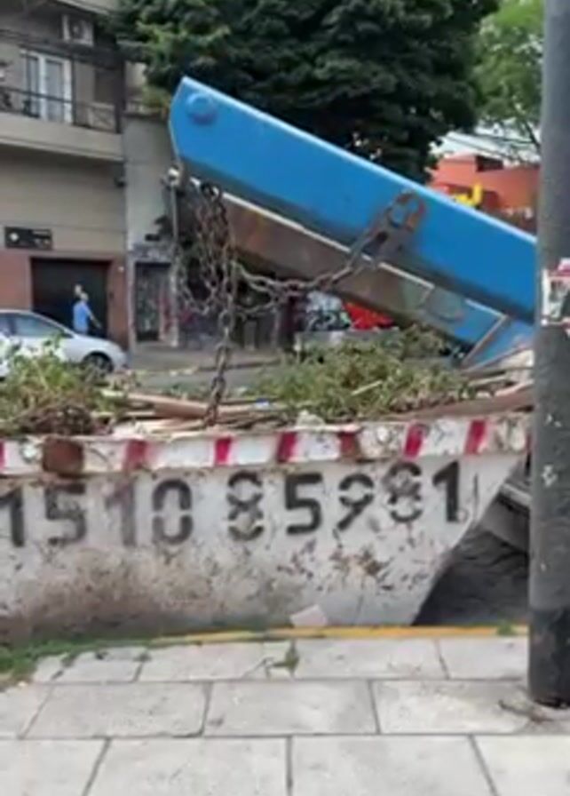 large, white, open-topped dumpster on a city street. The dumpster, marked with the number 1510 85931, is filled with green branches, leaves, and some pieces of wood. A blue crane arm hangs over the dumpster, held in place by heavy chains. Cars drive by in the background. The scene is set on a paved sidewalk in front of buildings with trees in the vicinity. A lamppost is visible in the foreground.