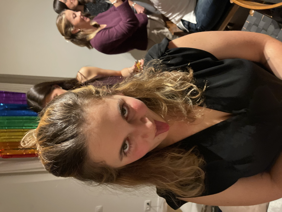 A group of people are gathered indoors. A woman in a black top sticks her tongue out toward the camera. Others are seated or standing nearby, including a woman in a purple top and another with dark hair visible in the background. A rainbow-colored decoration hangs near the left edge.