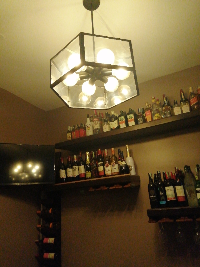 A room with a high ceiling features a geometric chandelier with multiple light bulbs. Three shelves display a variety of liquor bottles, including wine and spirits. A flat-screen television is mounted on the wall next to the shelves. A wine rack holding several bottles is placed along the left wall. The walls are painted a muted brown tone.