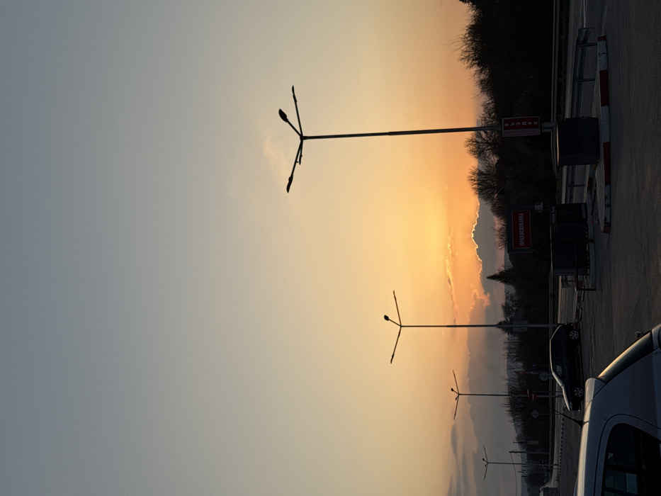 The image depicts a static outdoor scene at either sunrise or sunset in Dalgopol, Bulgaria, characterized by warm orange and yellow hues at the horizon transitioning to light blue in the upper sky. The foreground features a paved asphalt surface. In the bottom left, the rear section of a silver/grey passenger car is partially visible, indicating it is parked. To the right, two concrete blocks with red and white striped curb markings delineate an area. Three dark, multi-headed street light poles are silhouetted against the sky, with the tallest located prominently on the right side, extending towards the top of the frame. A two-lane asphalt road traverses the midground horizontally. A dark-colored hatchback car is parked on the left side of the road, facing left. On the right side of the road, a red rectangular sign displays white Cyrillic text "ПРЕДСТОЯНКА" (PREDSTOYANKA), with "ВАЖИ ЗА" (VALID FOR) visible below it, indicating a designated stop or stand area. Below this sign are dark-colored, rectangular roadside structures, possibly kiosks or enclosures. The background consists of a dense line of bare deciduous trees and bushes, silhouetted against the horizon, with rolling hills or mountains faintly visible beyond them. The sky above the horizon shows a layer of dark, silhouetted clouds. No individuals are present in the scene.