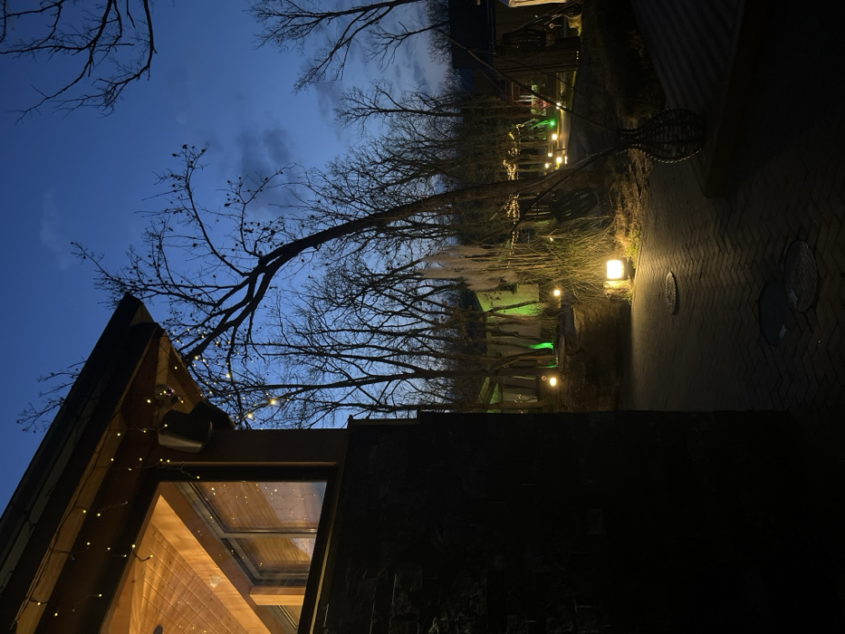 This image depicts an outdoor area at dusk or early night in Burgas, Bulgaria. The sky is dark blue with minimal cloud cover. In the foreground and to the left, a building with dark stone or brick siding features a large window on its upper floor. The interior visible through the window displays warm lighting and a wooden ceiling. Yellow-white icicle string lights are suspended from the building's eaves, where a dark speaker is also mounted. A paved pathway, constructed from dark interlocking pavers, extends from the foreground into the mid-ground, curving slightly to the right. Several circular manhole covers are visible on the path. Ground-level square luminaires emit warm white light, illuminating sections of the pathway and surrounding vegetation. The mid-ground and background feature numerous bare deciduous trees, suggesting a late autumn or winter setting. Tall, light-colored ornamental grasses or reeds are prominent in the mid-ground, illuminated by ground lights. Various smaller structures or pavilions are nestled among the trees in the background, some of which are highlighted by bright green spotlights. Additional string lights are strung between trees further in the background. To the lower right, a dark, woven vase or planter containing several thin, bare branches is visible on a dark, textured surface. No individuals are present in the scene.