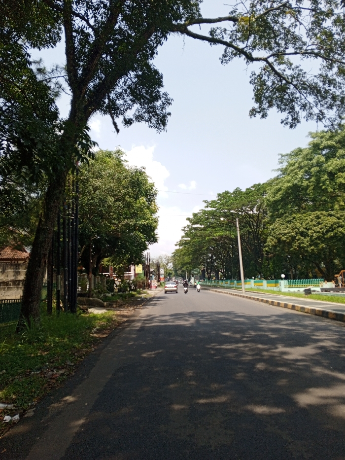 The image displays a daytime street scene in Multhan, India. A multi-lane asphalt road stretches into the background, marked by distinct shadows of overhead trees. A light-colored sedan is visible traveling away from the viewer, followed by two motorcycles, each with a single rider. Additional vehicles are present in the distant background. To the left, a prominent tree trunk stands beside a paved shoulder, backed by dark vertical poles and a low, light-colored wall. Various green trees and foliage line the left side of the road, partially obscuring background structures. To the right, a median strip separates the road, featuring yellow and black striped curbing, green vegetation, a street light pole, and a green metal fence with yellow accents. A dense canopy of large green trees borders the right side of the road. The sky is clear blue with scattered white clouds.