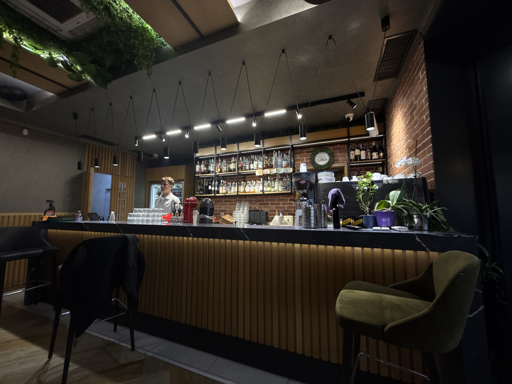 The image depicts the interior of a bar, possibly located in Radilovo, Bulgaria, although this location cannot be confirmed from the visual data alone. The bar features a long countertop with a wooden-textured facade. A variety of glassware, equipment, and decorative plants are arranged on the countertop. Shelves behind the bar display numerous bottles of alcohol. A person, presumably a bartender, is visible behind the counter. A green upholstered chair is situated in front of the bar. The lighting consists of pendant lamps suspended from the ceiling. The environment is modern and well-lit, with a brick wall as a prominent feature.