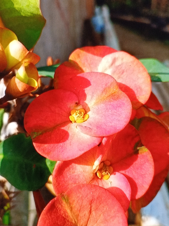This image presents a close-up, brightly lit view of multiple *Euphorbia milii* flowers, commonly known as Crown of Thorns, situated in Taungpi, Myanmar (Burma). The primary subjects are the plant's inflorescences, characterized by prominent, petal-like bracts ranging in color from vibrant red to deep pink and subtle orange-red tones. Each cluster of bracts encircles small, yellowish structures at its center, identified as cyathia, which contain the true flowers. Green foliage is visible within the frame, with some leaves appearing sharply defined and others blurred due to a shallow depth of field. Direct sunlight illuminates the scene from the upper left, creating distinct highlights on the bracts and casting soft shadows that enhance their three-dimensional quality. The overall composition is a tight vertical shot focusing on the cluster of blooms. The background is significantly out of focus, rendering specific objects indistinct. Visible elements in the blurred background include lighter, possibly tan or beige surfaces, and darker areas consistent with shadowed foliage or structures. A small, highly blurred blue object is discernible in the upper right quadrant of the background. No people or animals are present. The scene depicts a static, outdoor botanical subject under natural lighting conditions.