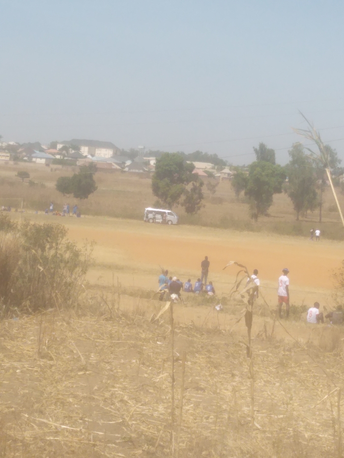 The image displays an outdoor scene in Barikin Jirga Summa, Nigeria, characterized by a hazy, pale blue sky over a dry landscape. The foreground features an expanse of light-brown, dry vegetation, resembling withered crops or grasses. In the midground, a large, reddish-brown dirt field extends, hosting several groups of individuals and a vehicle. A white passenger van is situated on the left side of the dirt field. Nearby, approximately 5-6 individuals, some wearing blue attire, are gathered near a metal structure resembling a goalpost. Further right and closer to the foreground on the field, a second group comprises approximately 10-12 individuals. Several in this group are seated on the ground, some in blue, others in white or red clothing. Two white soccer balls are visible on the ground near them. Two individuals are standing within this group: one in a dark top facing left, and another in a white top and red shorts facing generally right. In the distant midground, 2-3 faint figures are discernible on the field. The background reveals a residential area or small town with various buildings, including multi-story structures, interspersed with green trees. The ground in the background also appears dry and light brown. The overall scene suggests a sporting event or practice, likely soccer, taking place in a semi-arid environment.