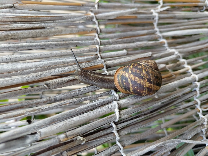 - "A single land snail is depicted in a vertical orientation, actively ascending or resting on a fence constructed from dried, light brown to grayish-brown natural plant stalks" by FM-3Ip2o1, licensed under CC BY 4.0