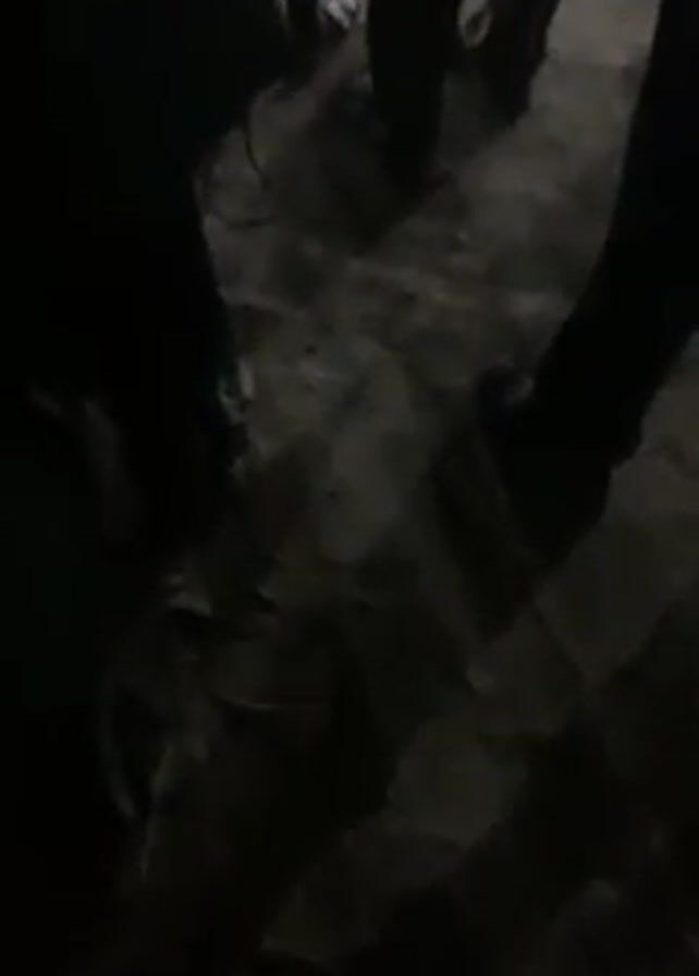 A group of people stand near the edge of a soccer field at night. They are watching a soccer game taking place on the field, which is illuminated by bright lights. The soccer field is surrounded by a wire fence. The people appear to be observing the game intently. One person is wearing a jersey with the number 23 on the back and the name "JAMES" above it. The ground near the viewers is uneven. The video is somewhat dark and the details are hard to distinguish.