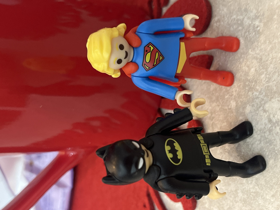 In Budva, Montenegro, two Playmobil figures are depicted standing on a light-colored, mottled surface. The figure on the left is dressed as Batman, wearing a black suit with a yellow bat symbol on the chest, a yellow utility belt, a black cape with scalloped edges, and a black cowl. The figure on the right is dressed as Supergirl, featuring blonde hair, a blue top with a red and yellow 'S' shield logo, red trousers, and a red cape. Both figures face forward, their arms at their sides. In the blurred background, a large red ceramic or enamel mug with a handle is visible on the left, set against a red table runner or similar fabric, with additional out-of-focus red decorative shapes.