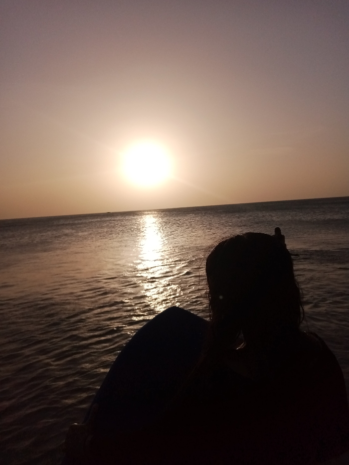 The image portrays a coastal scene in Juan Griego, Venezuela, during either sunrise or sunset. A single human figure is positioned in the lower right quadrant, rendered in full silhouette due to backlighting. The individual appears to be seated or reclining, with their lower body partially submerged in the calm water. The figure faces towards the bright, low-lying sun, which is located in the left-center of the frame, just above the horizon. A prominent, shimmering reflection of the sun extends diagonally across the water's surface towards the foreground. The sky above the horizon presents a gradient of light orange and subtle purple coloration. The horizon line is clearly defined across the width of the image. A small, dark, indistinct object is faintly visible floating on the water's surface in the middle distance, to the right of the sun's reflection.