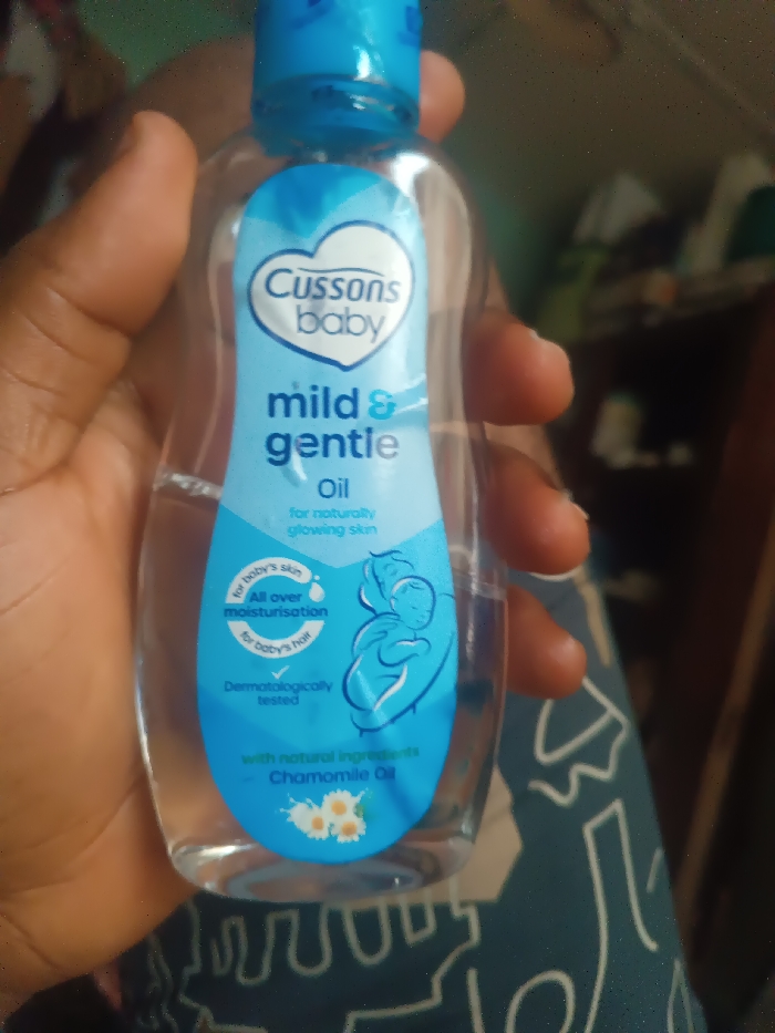 The scene depicts a clear plastic bottle of "Cussons Baby mild & gentle oil," approximately 3/4 full, held by a person's left hand