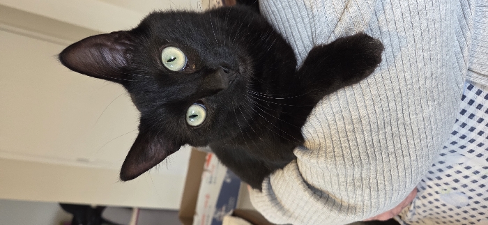 - "An indoor scene in Rouvroy, France, depicts a black feline with prominent bright green eyes and dilated pupils resting on a person's left shoulder" by FM-Zf2Xx1, licensed under CC BY 4.0