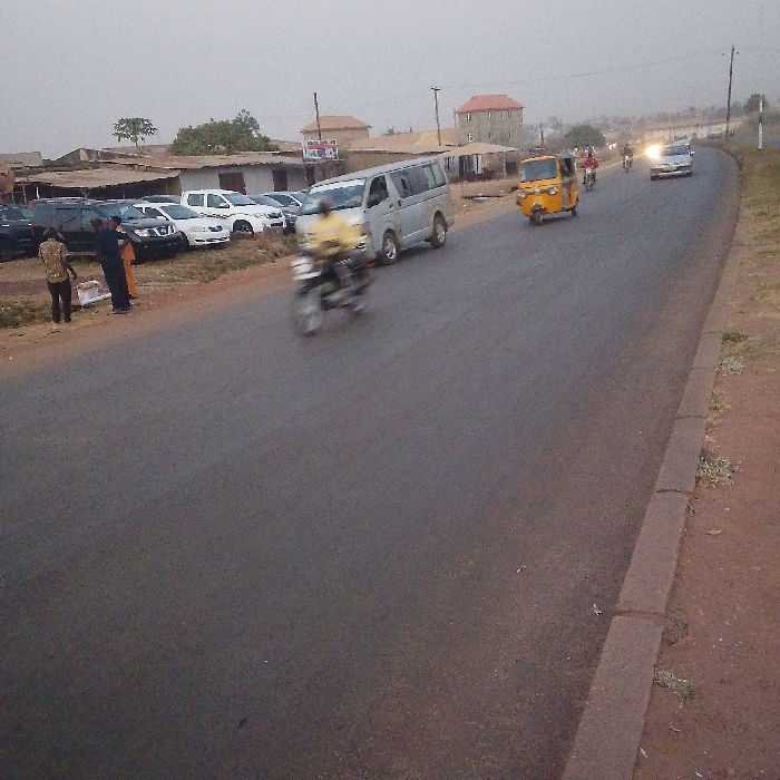 A street scene with cars and people along the roadside, and moving vehicles, including a tricycle and a motorcycle, on the road. There's a line of parked vehicles including SUVs and vans next to a group of people on the left. The road curves and has a grey curb on the right, with vegetation and red soil on the side. Buildings are visible in the background under an overcast sky.
