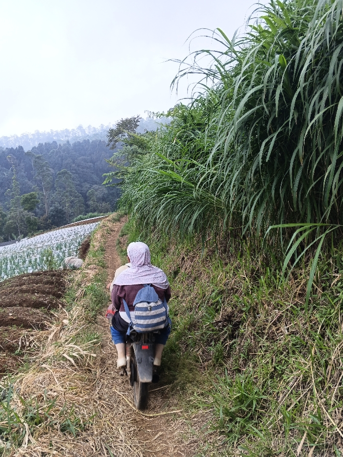 - "An individual wearing a light-colored head covering, a dark red upper garment, and blue pants is observed from the rear, riding a dark-colored motorcycle with a red taillight on a narrow, unpaved dirt path" by FM-hzwcH2, licensed under CC BY 4.0