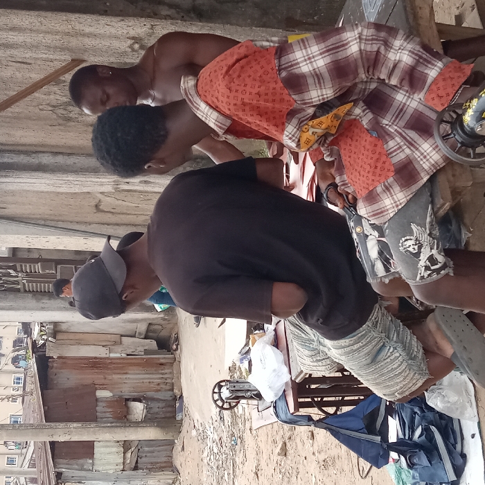 Three men are gathered around a table on a street. Two are sitting and one is standing. One of the men has no shirt on. The man who is sitting in the middle is holding a pair of scissors in his right hand. There is a sewing machine sitting on the table. There are various buildings and construction in the background.