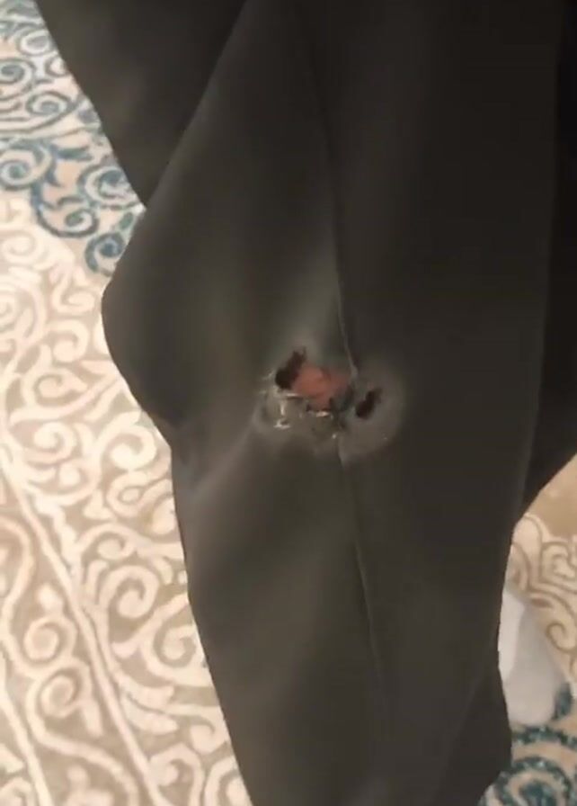 knee of a person's black pants, which has a round hole in it. The person is wearing white socks and standing on a rug with a patterned design. A voice speaks in the background.