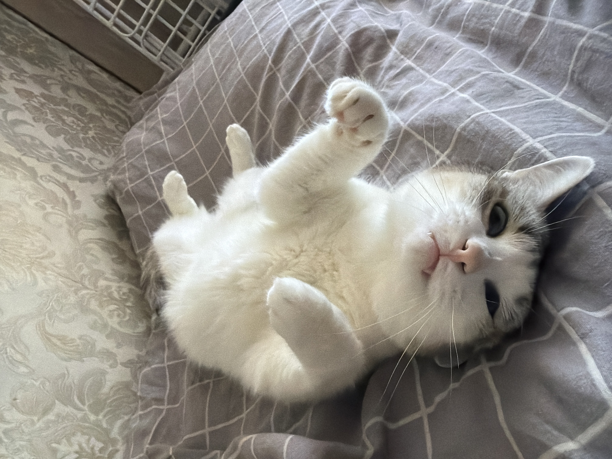 A domestic cat is observed lying supine on a grey, grid-patterned bedsheet within an indoor setting in Izhevsk, Russia. The cat is predominantly white with light brown-grey markings on its face and ears. Its head is oriented with the muzzle pointing towards the top of the frame, eyes open and gazing directly forward. The paws are extended, with one front paw curled, revealing pink paw pads. The background features a light beige wall with an embossed damask pattern. To the right, a white grid-like object, possibly a storage basket or furniture component, is partially visible, adjacent to a darker vertical surface.