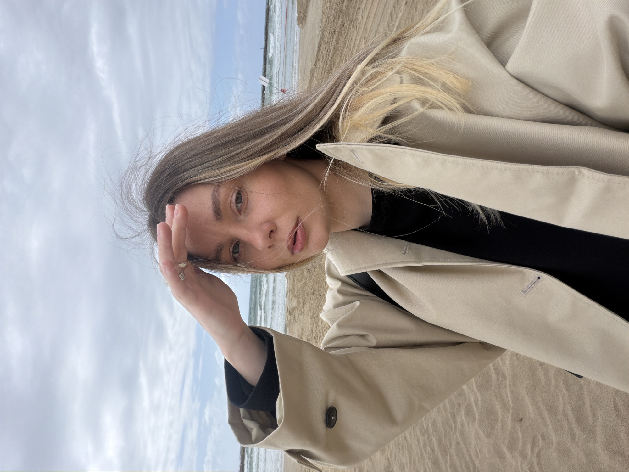 A young woman with shoulder-length blonde hair poses on a beach. She wears a tan trench coat over a black top. Her left hand is raised to shield her eyes. Behind her, the Mediterranean Sea meets a sandy beach under a cloudy sky. In the distance, structures can be seen along the coast, which suggests this location is in or near an urban area. Considering the architecture visible in the background and the likelihood of beaches on the Mediterranean coast, this is probably in Tel-Aviv, Israel.