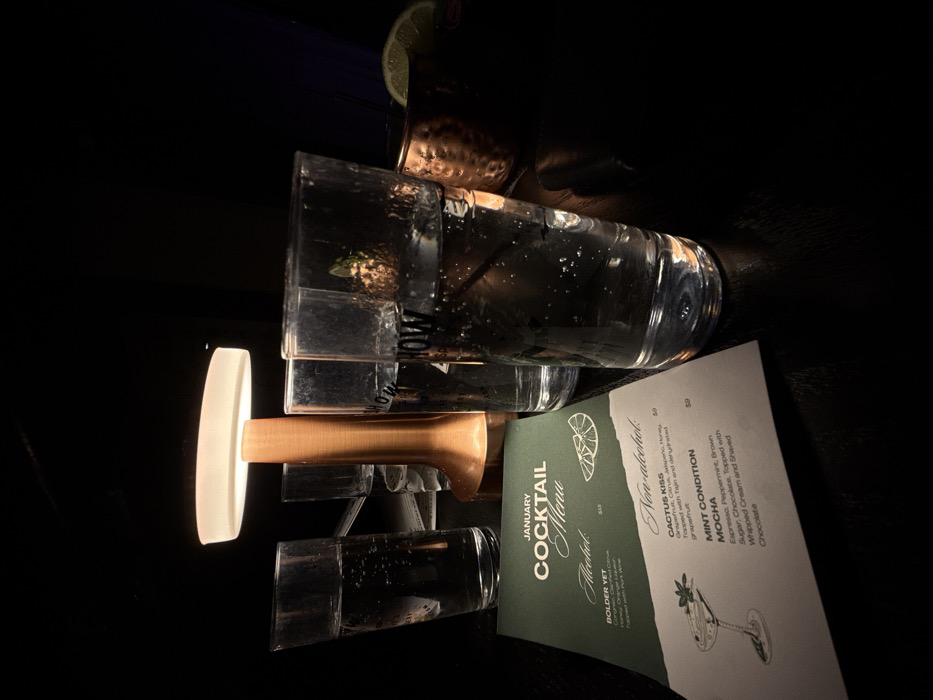 dimly lit table with several items. Two clear, cylindrical glasses and a copper mug with a lime wedge are visible. A menu titled "January Cocktail Menu" lists several drinks, including "Bolder Yet," "Cactus Kiss," "Mint Condition," and "Mocha," along with their ingredients and prices. A light source illuminates part of the menu. The overall scene suggests a bar or lounge setting.