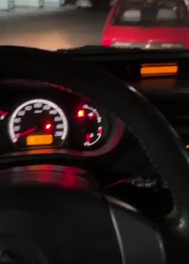 From the perspective of a driver inside a car, the video shows a nighttime scene of parked vehicles