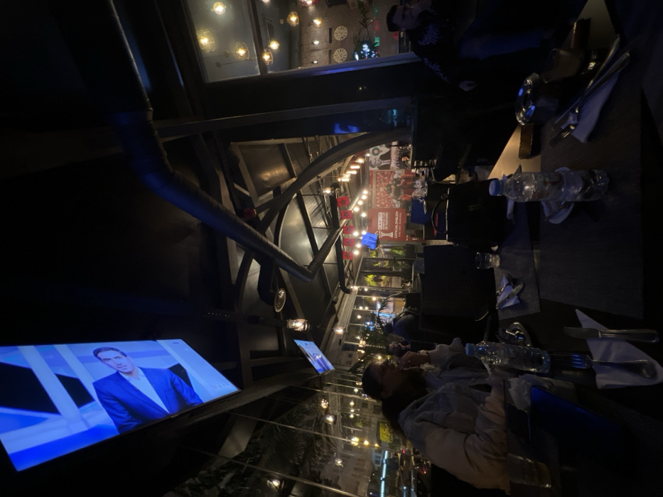 An angled view reveals a dark, modern interior space. Industrial pipe structures and warm lighting create a textured ambiance. TVs display content. A woman sits at a table, next to a water bottle, cutlery, and napkins. Another person sits at the adjacent table. A football flag banner hangs with some lighting in the background.