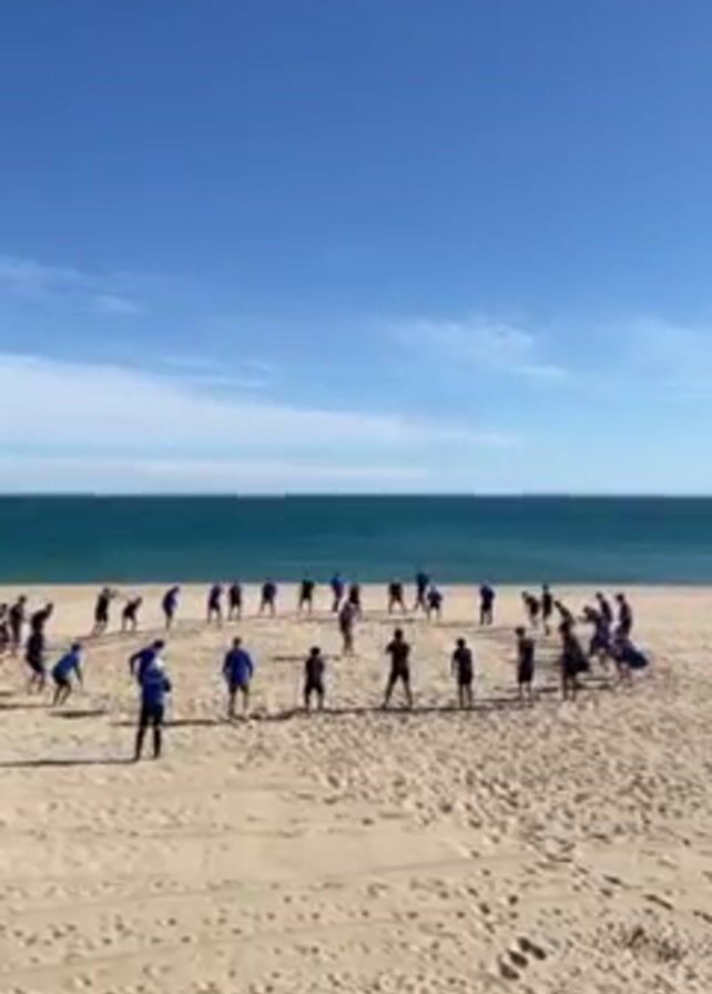 A group of approximately 30 people are on a beach, standing in a large circle. The people are wearing black or blue clothing. Some of the individuals are bending over and stretching or doing calisthenics, while a person in blue appears to be instructing them. The beach is sandy, and the sea is visible in the background. The sky is blue and mostly clear with light white clouds. The camera is stationary and the shot is a long shot.