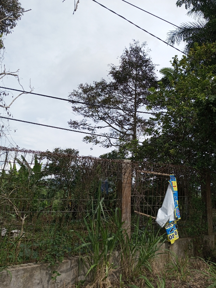 An outdoor scene in Kandenuwara, Sri Lanka, depicts an overgrown landscape under an overcast, light gray sky. Three dark utility lines traverse the upper portion of the image. A tall, slender tree with dark green foliage stands prominently in the mid-ground, flanked by denser green trees to the right, including a visible palm frond, and sparser branches on the far left. A wire mesh fence, heavily overgrown with vines and various green and brown vegetation, including broad banana-like leaves, runs horizontally across the mid-ground. The fence is supported by a thick, square concrete post positioned slightly to the right of the image center. A piece of white and blue plastic material, possibly a discarded bag or a torn banner featuring partial yellow text including "088", is draped over the wire fence to the right of the concrete post. Below the fence, a concrete retaining wall forms the base, with dense, tall green grass and weeds occupying the immediate foreground. No people are visible.