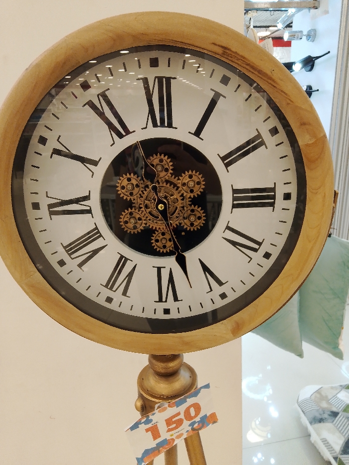 A close-up shot features a round, decorative clock. The clock has a light-colored wood frame. Its face is white with black Roman numerals and a transparent center, revealing visible gears. The clock's hands are black. The clock stands on a golden tripod base with a price tag attached. The background is slightly blurred, showing parts of a retail setting, including a pillow and furniture.