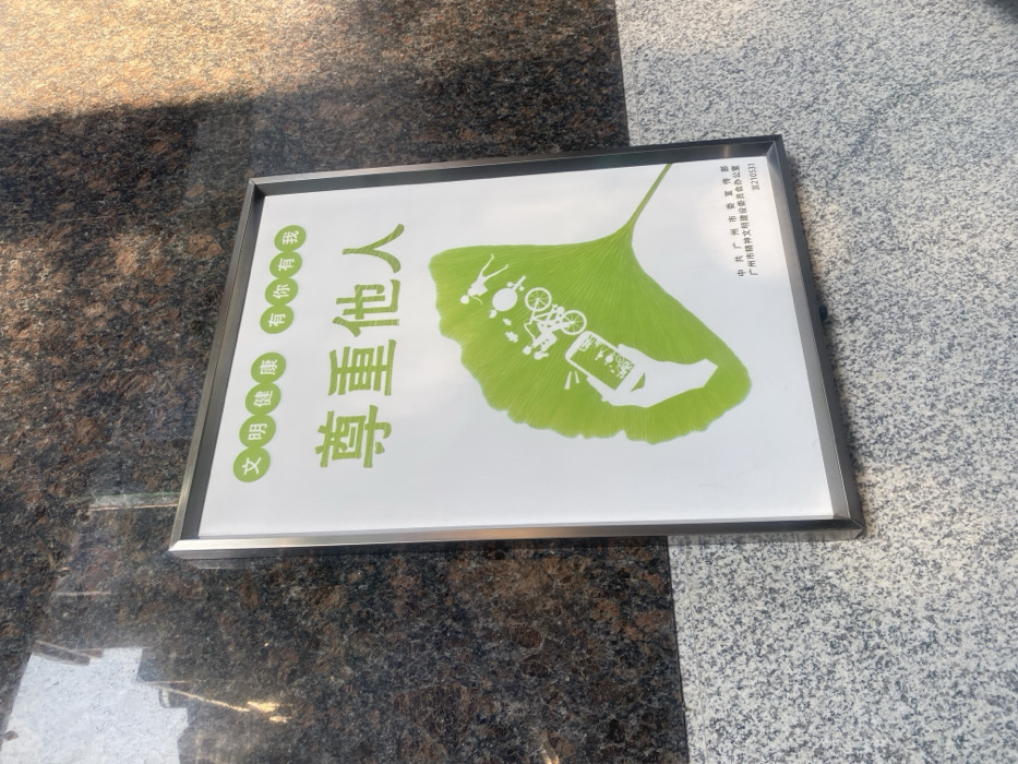 framed public service announcement sign lying on the ground. The sign features a green ginkgo leaf graphic. Within the leaf are white silhouettes of a person walking, a bicycle, and a hand holding a smartphone. To the left of the leaf are green Chinese characters that translate to "Civilized and healthy, you and I have me", followed by a larger line that translates to "Respect others". In the upper right corner are more Chinese characters identifying the sponsoring organizations: the Guangzhou Municipal Committee Propaganda Department and the Guangzhou Spiritual Civilization Construction Committee Office. A number is also printed: 210531.