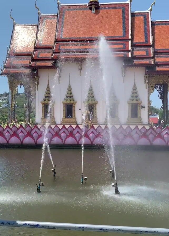 The video features an elaborate temple complex in Thailand. In the first shot, a white temple with an orange roof is seen from a distance, with water fountains spraying in the foreground. The fountains are in a body of water surrounded by pink lotus-shaped decorations. The second shot shifts to a golden statue of a mythical bird-like creature and a smaller shrine on a platform extending into the water. The final shot is a low-angle perspective looking up at an enormous statue of a smiling Buddha, situated on a lotus platform decorated with golden pillars. A small group of people, including children, are at the statue's base. The sky is clear and blue.