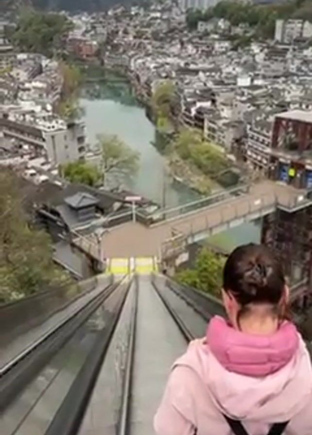 A woman stands on a downward-moving escalator, her back to the camera. She has her hair in a bun and wears a pink jacket with a pink backpack. The escalator descends steeply, offering a panoramic view of a densely populated town nestled among hills. The town is characterized by closely packed buildings with grey roofs, interspersed with greenery. A river flows through the center of the town, reflecting the overcast sky. A pedestrian bridge spans the river. The overall scene suggests a location in a mountainous region with a traditional architectural style.