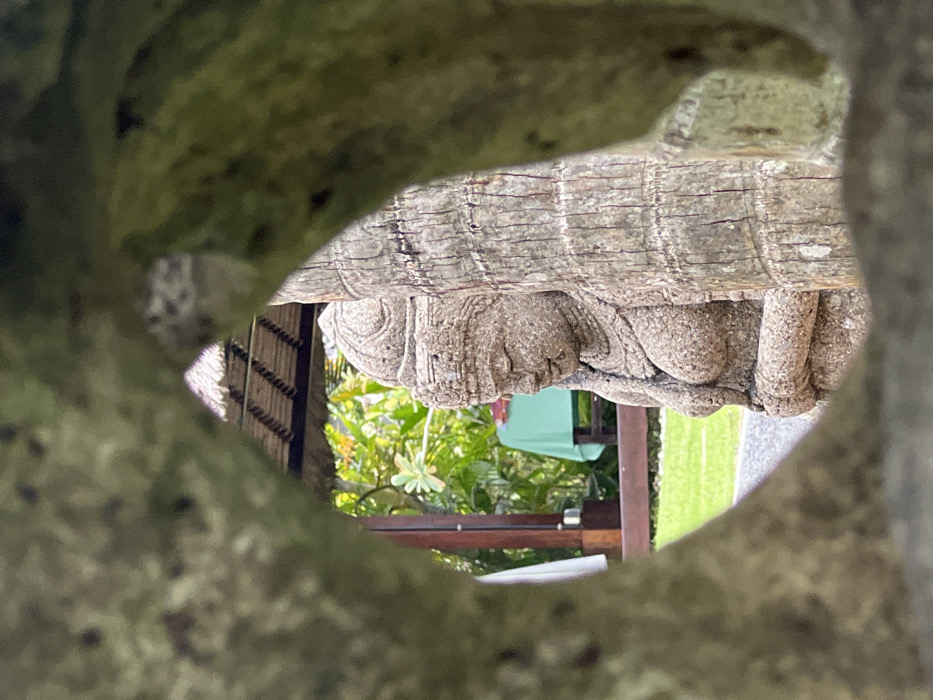 A stone statue is viewed through a large hole in a rough, textured surface. The statue is weathered and intricately carved, resting on a wooden beam. Through the hole, hints of a tropical setting are visible: thatched roofing, lush green foliage, a wooden structure, and a patch of bright green grass. The perspective is unusual, giving a glimpse into a serene garden setting.