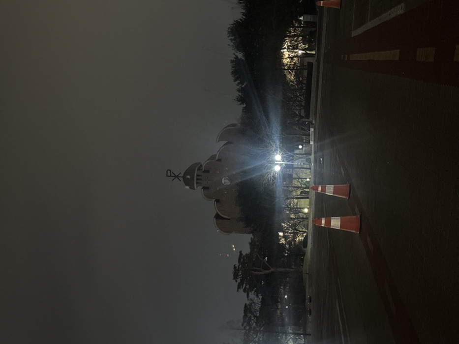 The image depicts the Cheongju Diocese Cathedral (Jeongdong Catholic Church) in Cheongju-si, South Korea, at night. The prominent, multi-tiered, reddish-brown church building dominates the mid-ground, featuring a distinctive domed roof topped with a large Chi Rho (PX) symbol. A circular element, possibly a clock face, is visible on its upper facade. In the foreground, a dark asphalt paved area, likely a parking lot, extends from the bottom of the frame. Two orange and white striped traffic cones are positioned centrally on this pavement, with a third partially visible on the far right. Red and white painted lines are present on the paved surface. Trees, some appearing bare-branched and others evergreen, line the perimeter between the paved area and the church, obscuring parts of the building's lower structure. Multiple bright streetlights or outdoor lamps are illuminated, casting strong lens flares, particularly a double-headed fixture located to the right of the image center. The sky is dark, suggesting nighttime, with ambient light appearing overcast or diffused. No individuals or vehicles are visible in the scene.